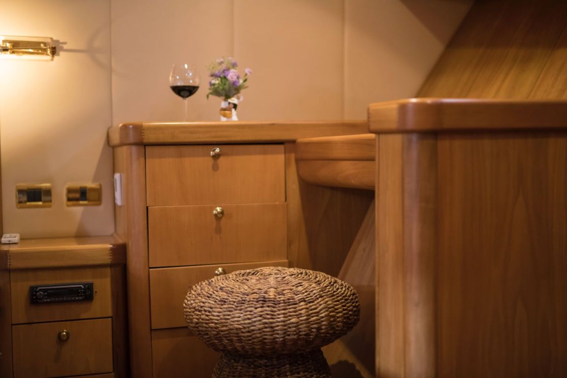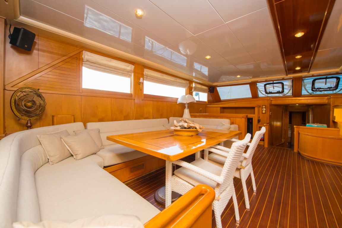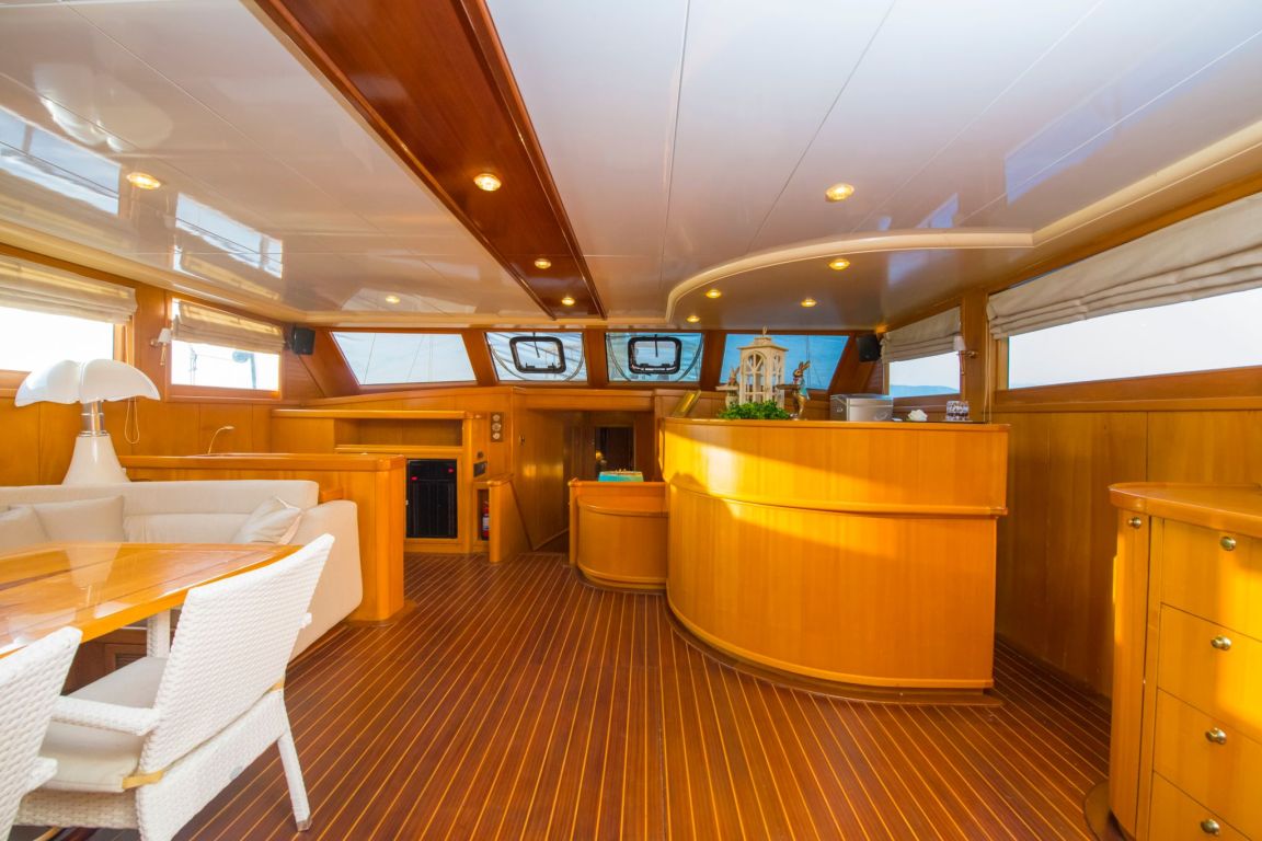 The outdoor living spaces are designed for maximum enjoyment at sea. The aft deck offers a large dining table and comfortable seating area ideal for alfresco meals, while the foredeck provides sunbathing mattresses and lounge areas where guests can relax under the Mediterranean sun. With wide deck spaces and balanced layout, the yacht is perfect for both relaxation and socializing.
