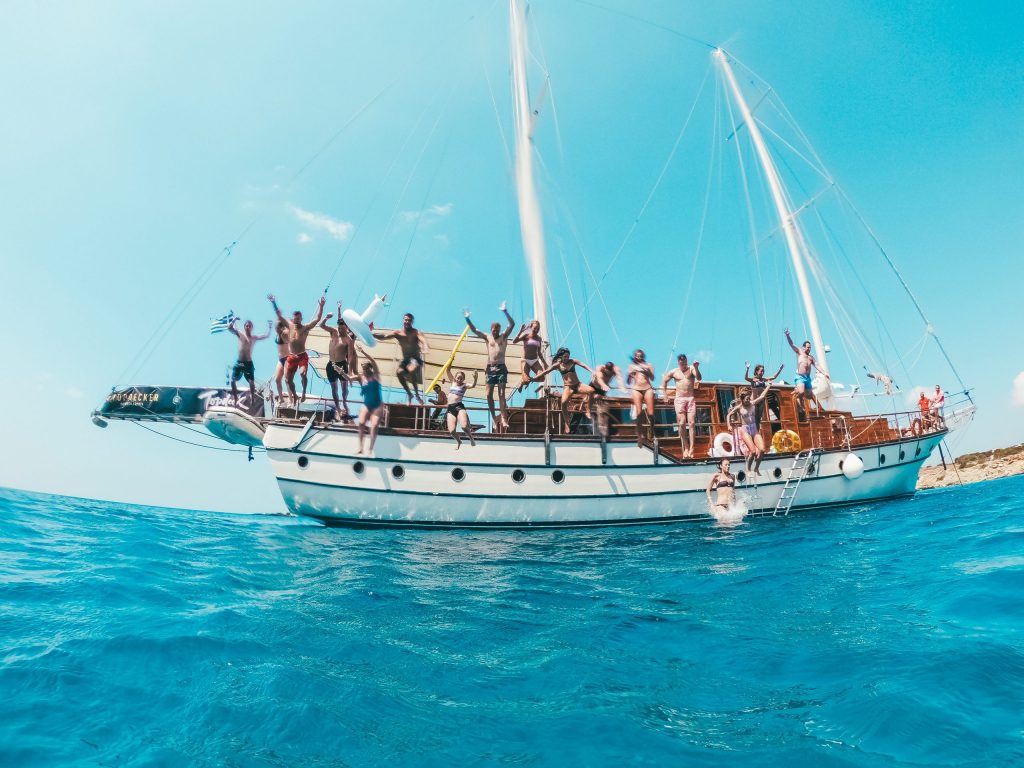 Before you reach the mainland, enjoy a swim-stop at Rhenia and get ready to experience a combination of, on and off-boat parties, that will make up for a day you will remember for