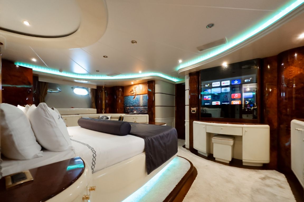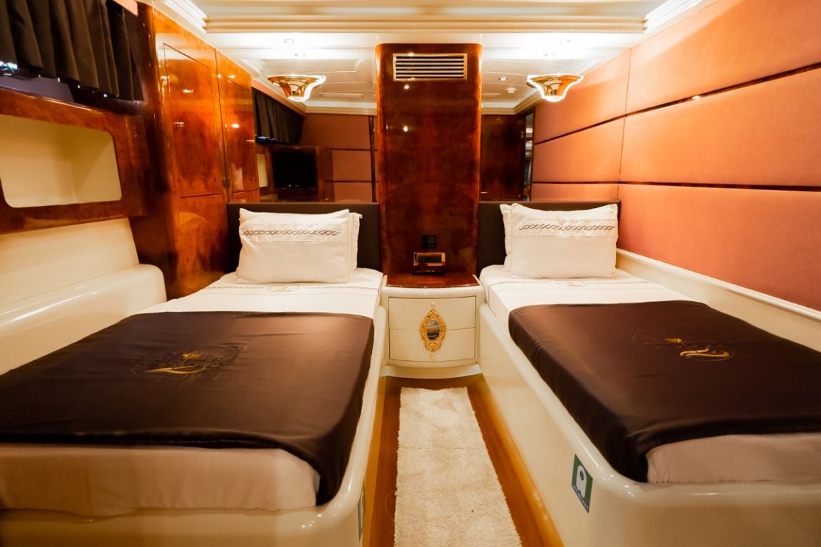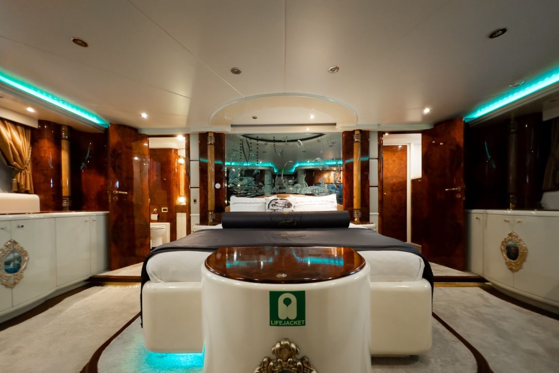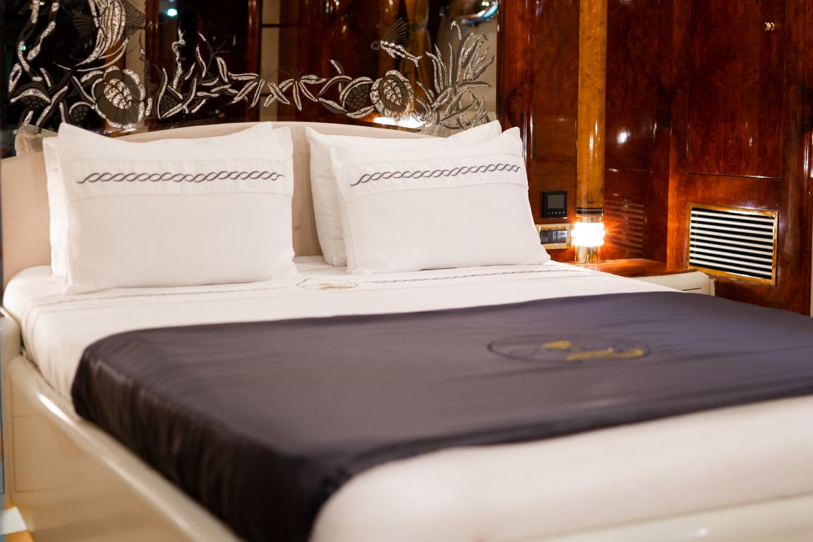 Up to 12 Guest; 1 VIP, 1 Master, 3 Double, 1 Twin Cabins. Master Cabin: Located on the lower deck, the spacious master cabin features a king size bed, Apple TV, internet access and Wi-Fi, a work/vanity desk and a cinema sound system. The cabin also includes RGB ambient lighting, air conditioning, jacuzzi, WC and a separate shower cabin. VIP Cabin: The VIP cabin is located on the main deck and offers a king size bed, Apple TV, internet access and Wi-Fi, a work/vanity desk and cinema sound system. Guests can enjoy RGB ambient lighting, air conditioning, jacuzzi, WC and a private shower cabin. Double Cabins (3): Three comfortable double cabins are located on the lower deck. Each cabin features a queen size bed, Apple TV, internet access and Wi-Fi, WC, shower cabin or bathtub and air conditioning. Twin Cabin: The twin cabin located on the lower deck offers two single beds, Apple TV, internet access and Wi-Fi, WC, shower cabin and air conditioning. |