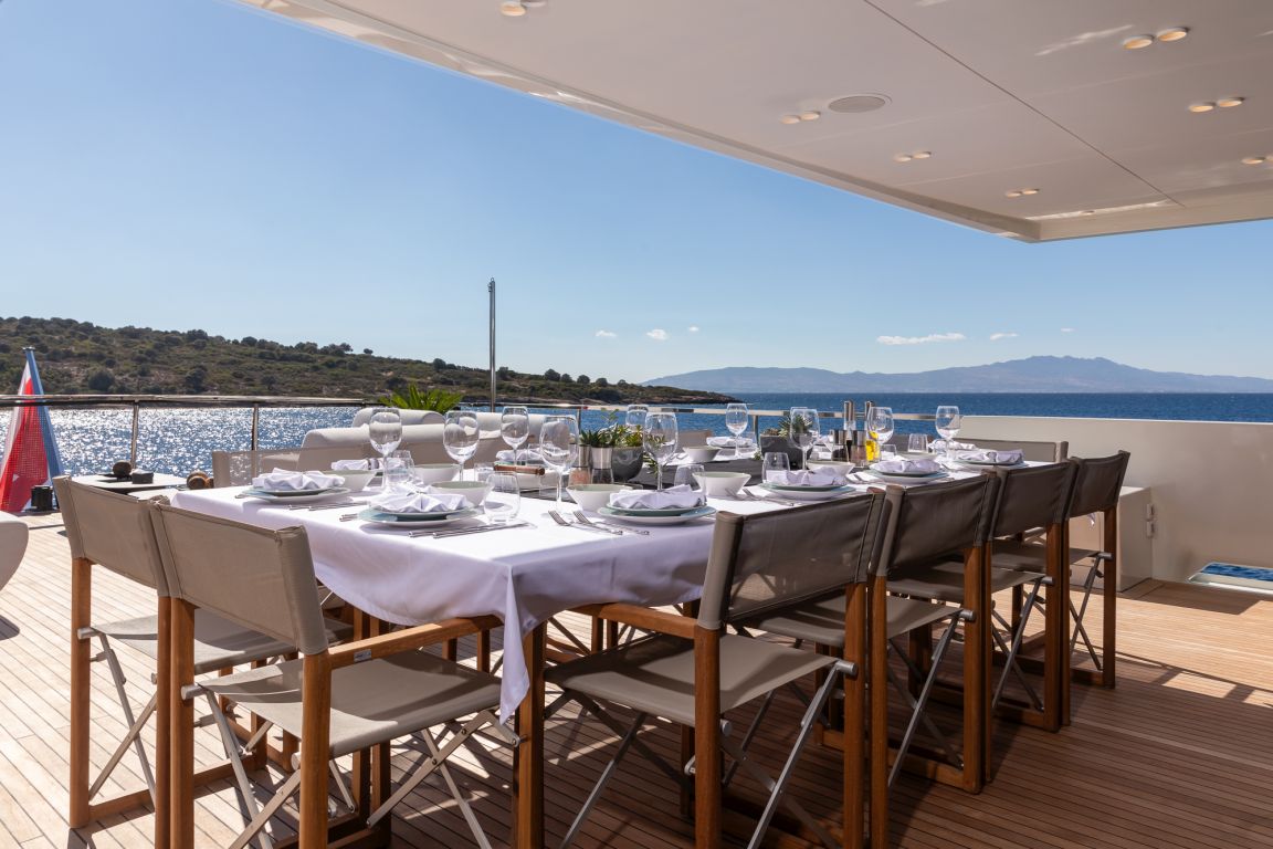 The interior of Illusion II features a sophisticated salon with contemporary decor, comfortable seating areas and a bright, open atmosphere, perfect for relaxing and socializing. The yacht`s exterior spaces are equally impressive, with large decks designed for maximum enjoyment. The aft deck offers a spacious dining area, while the flybridge provides panoramic views, sunbathing areas and a jacuzzi, creating the perfect setting to relax under the Mediterranean sun.