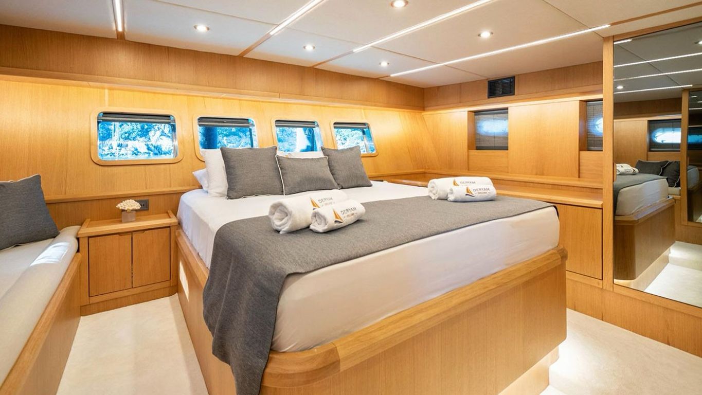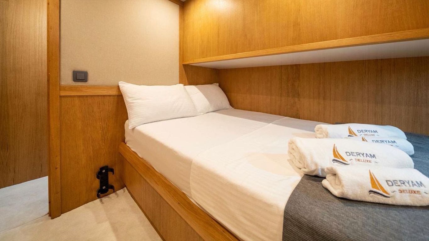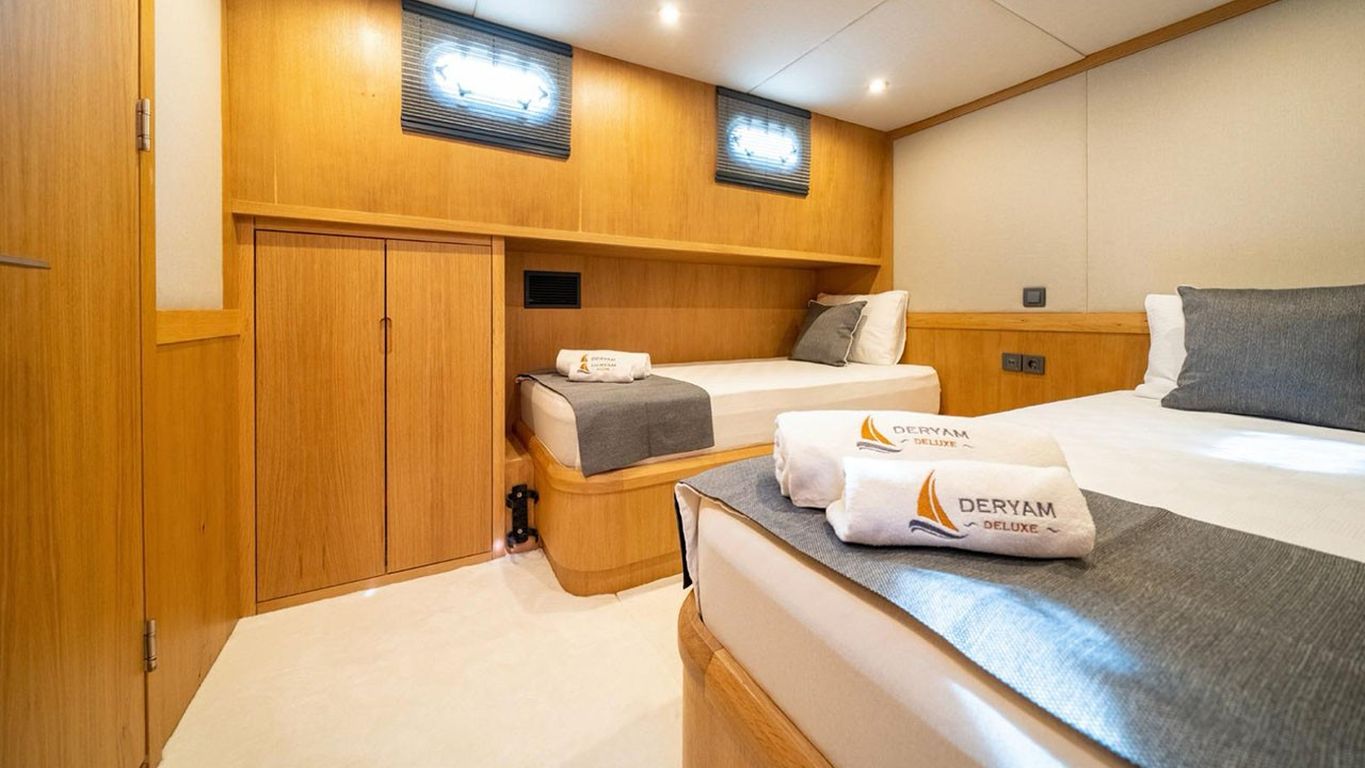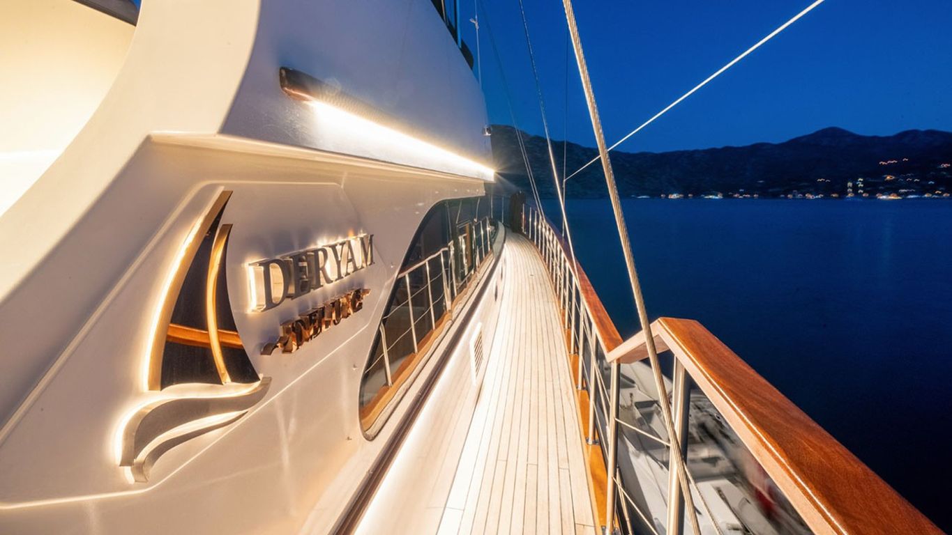 The Gulet Deryam Deluxe, a brand-new 23.95-metre luxury gulet, was launched in 2023 and combines fresh design and modern comfort. With five cabins, including two master cabins, one double cabin and two twin cabins, she can accommodate up to 10 guests in comfort. The 6.50-metre beam ensures airy interiors and expansive outdoor areas, making it an ideal choice for those seeking a spacious and airy living environment.