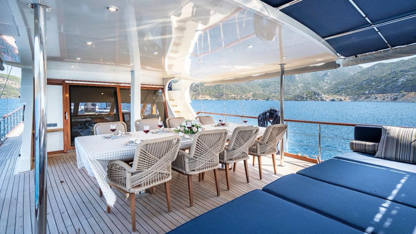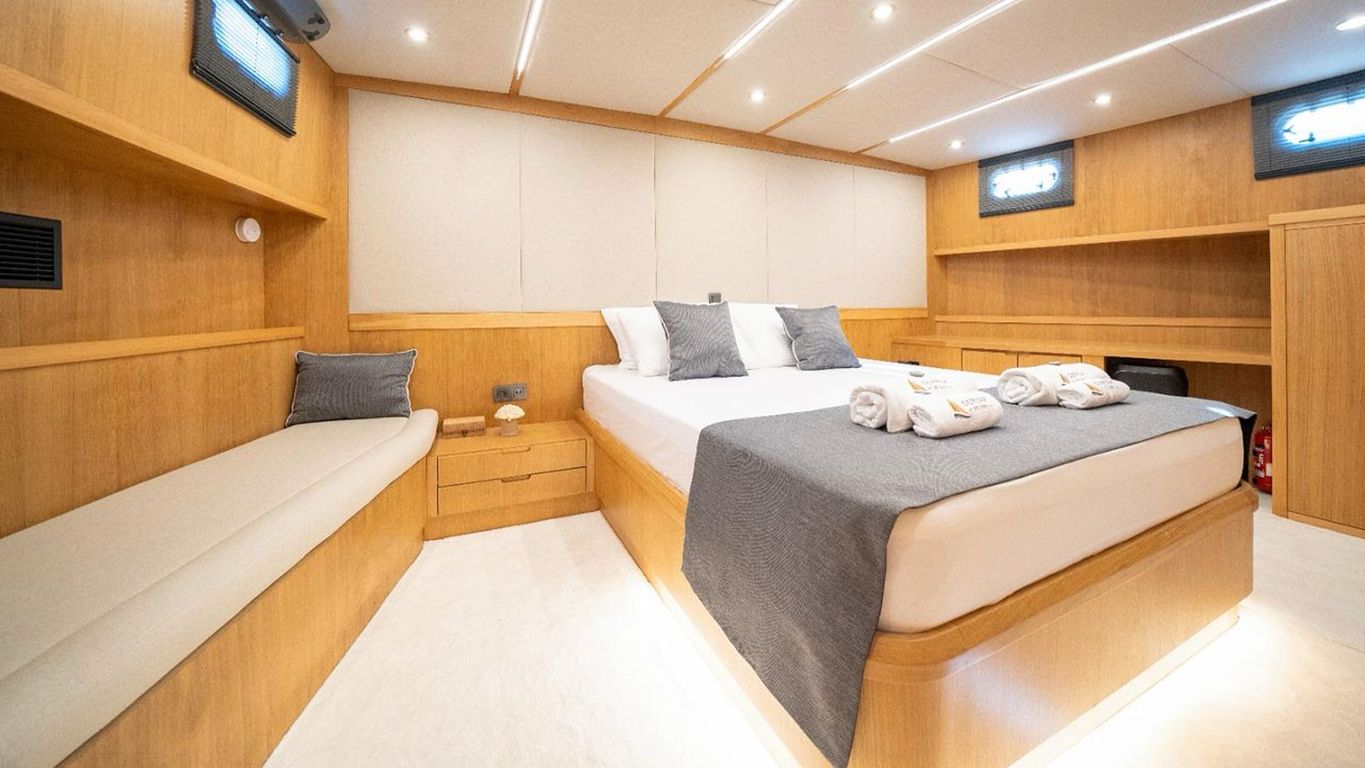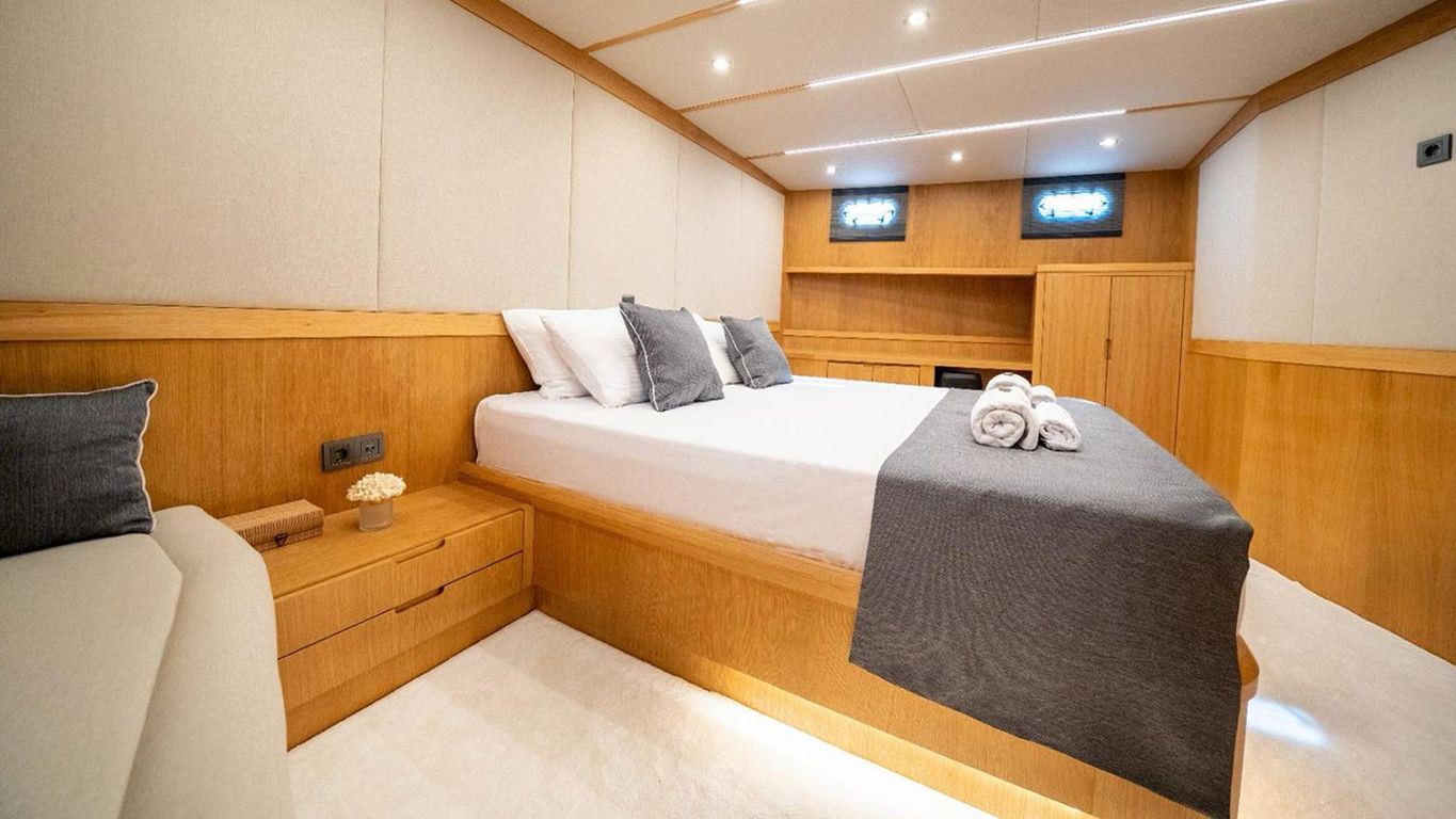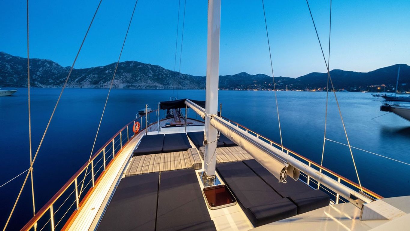 The Gulet Deryam Deluxe, a brand-new 23.95-metre luxury gulet, was launched in 2023 and combines fresh design and modern comfort. With five cabins, including two master cabins, one double cabin and two twin cabins, she can accommodate up to 10 guests in comfort. The 6.50-metre beam ensures airy interiors and expansive outdoor areas, making it an ideal choice for those seeking a spacious and airy living environment.