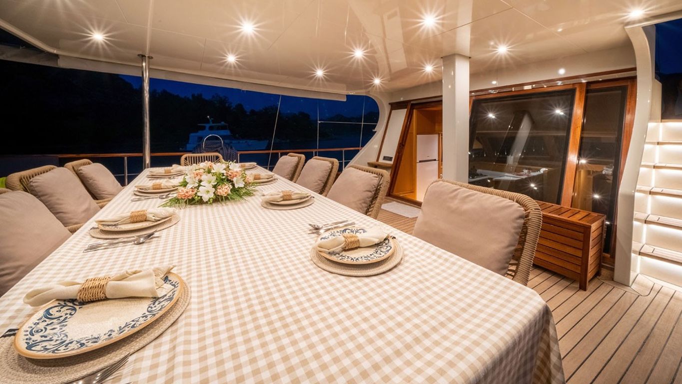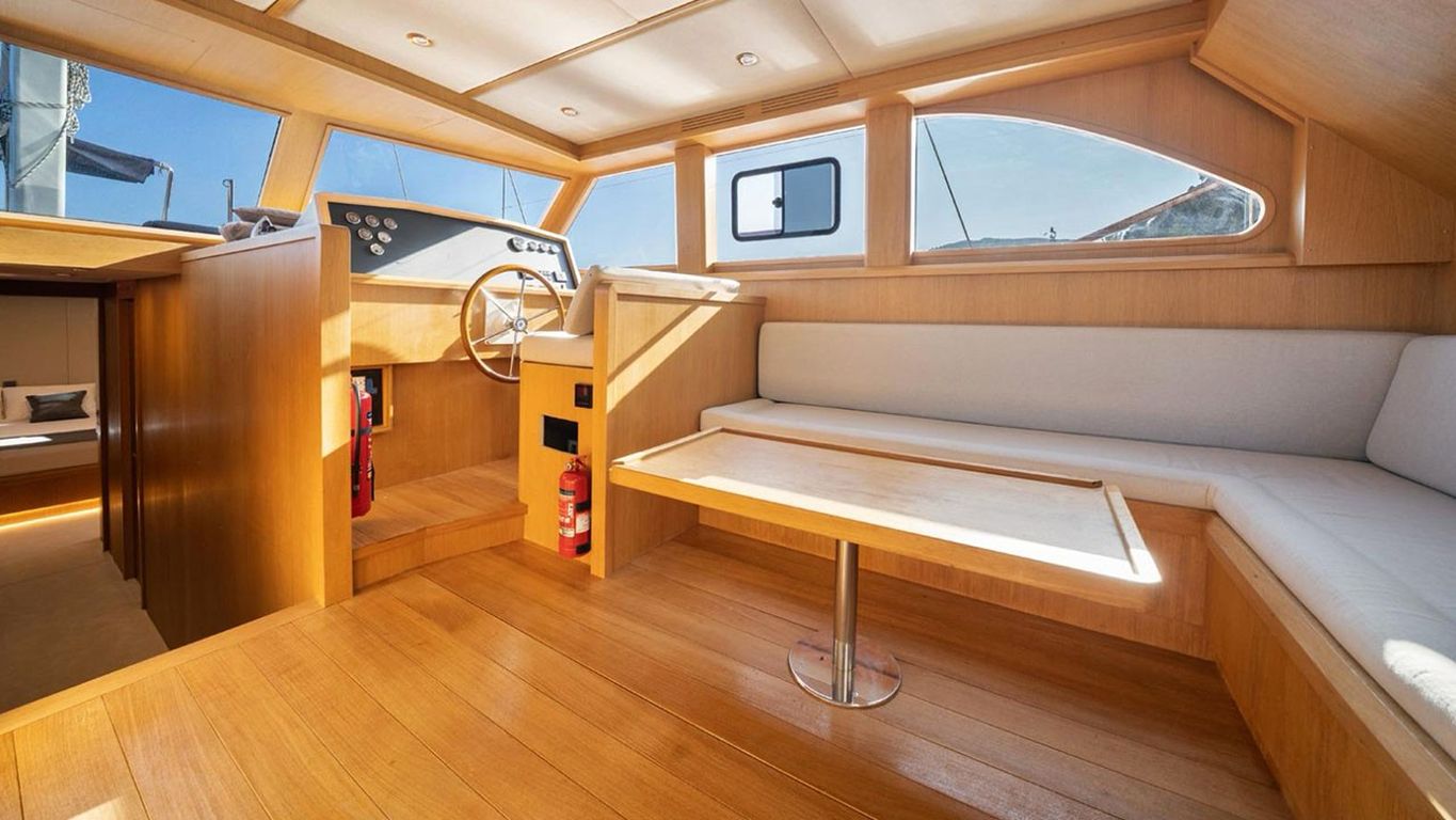 Guests can enjoy a range of amenities, including shaded dining areas, comfortable lounge seating, and ample sunbathing space. Inside, the modern saloon offers a cosy dining area, entertainment system and a fully equipped kitchen.
