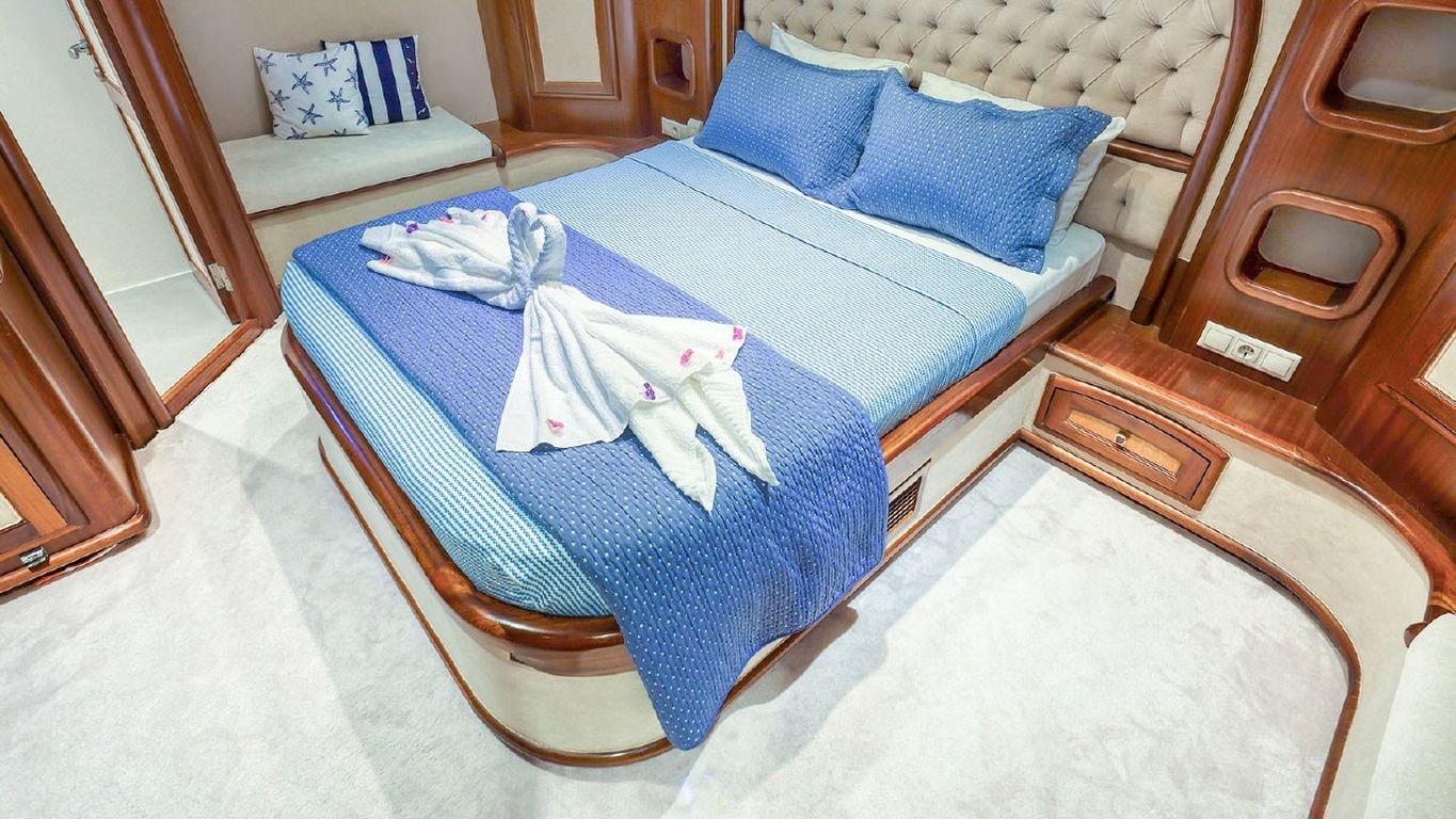 The Gulet Mehmet Ayaz is a 24-metre gulet built in 2008 and refitted in 2019. Designed to offer comfort and elegance at sea, it is the perfect vessel for those seeking a stylish and well-appointed experience. With five cabins, including two master cabins and three double cabins, she can accommodate up to ten guests. The 6.60-metre beam ensures that there is plenty of space inside the vessel, as well as on the spacious decks.