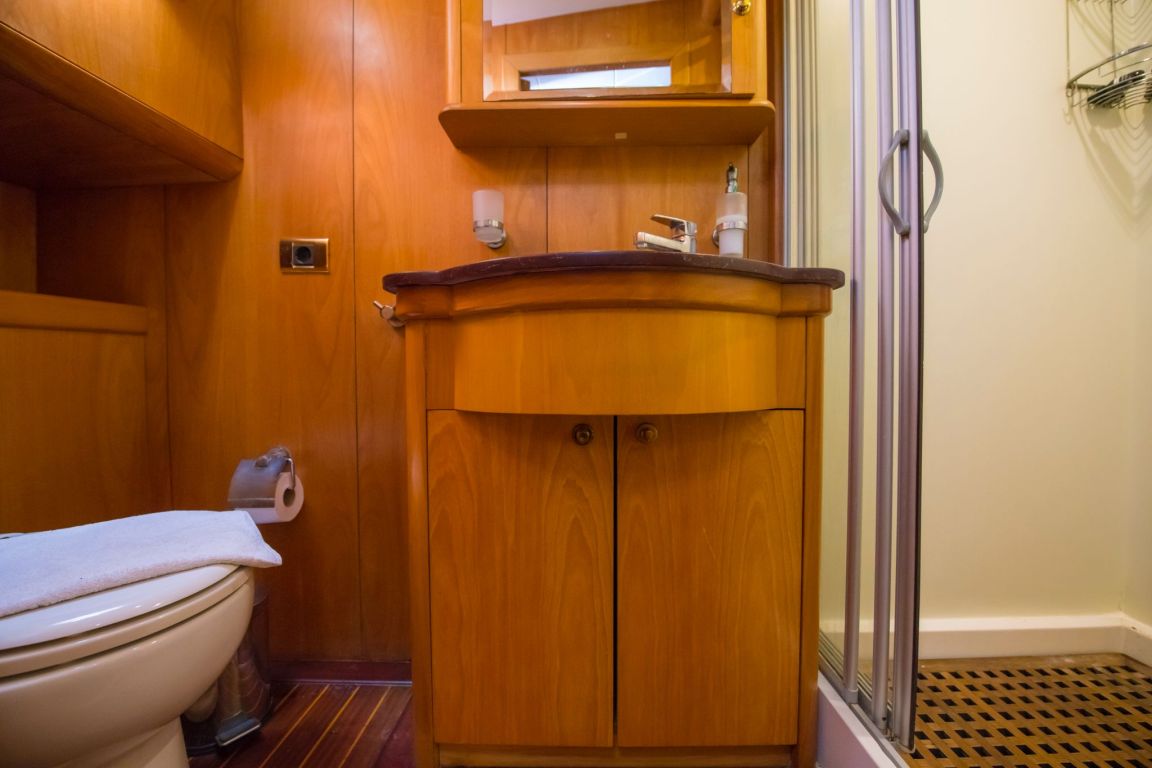 The outdoor living spaces are designed for maximum enjoyment at sea. The aft deck offers a large dining table and comfortable seating area ideal for alfresco meals, while the foredeck provides sunbathing mattresses and lounge areas where guests can relax under the Mediterranean sun. With wide deck spaces and balanced layout, the yacht is perfect for both relaxation and socializing.