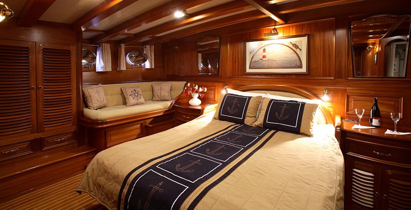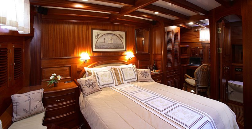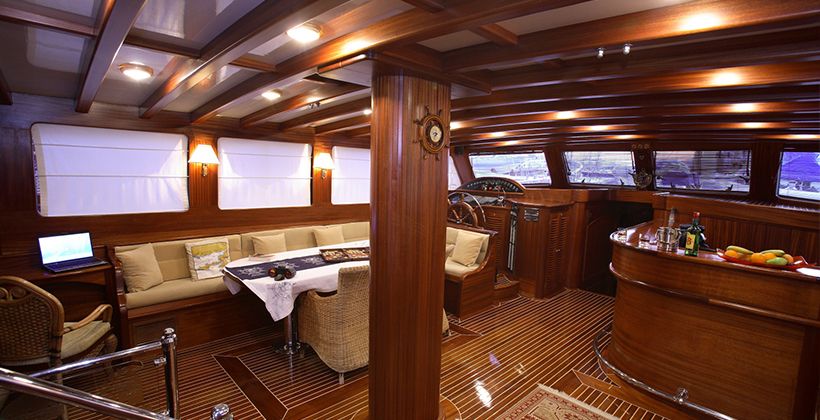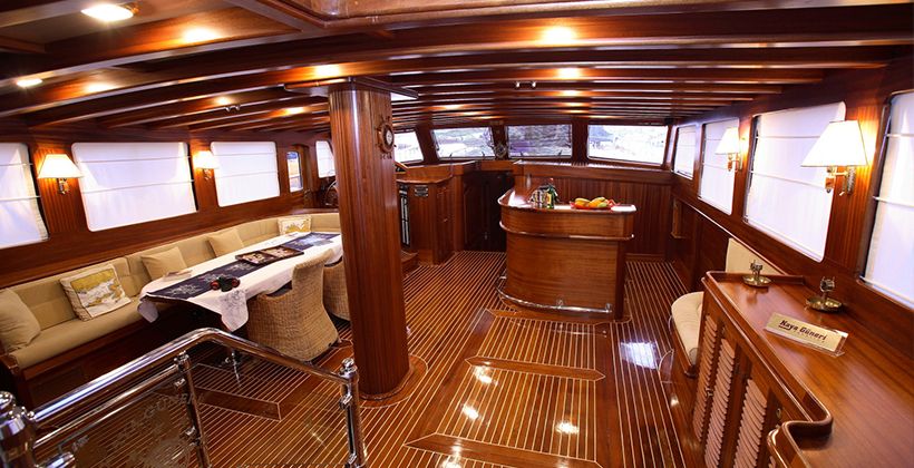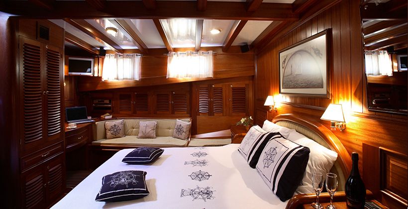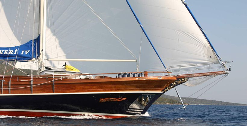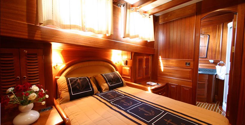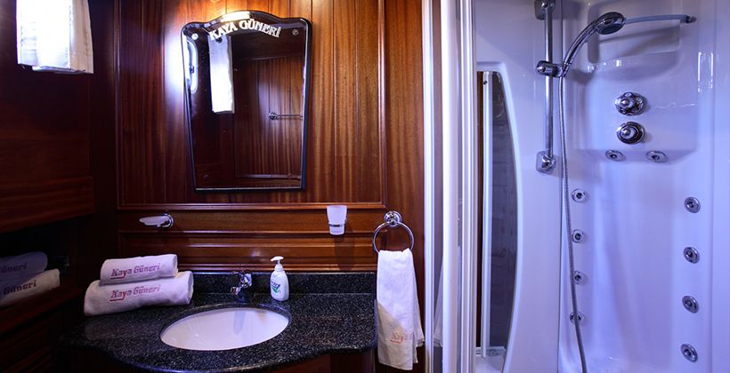 Kaya Guneri 4 gulet was produced in 2009. It offers you a blue voyage tour with a length of 34.60 meters. There are 6 double cabins, each with its own shower, WC and air conditioning. With our Kaya Guneri 4 boat, you can plan a pleasant and entertaining blue cruise holiday on any of the Bodrum, Gocek, Marmaris and Fethiye routes. Our Kaya Guneri 4 boat has separate dining areas on the deck and in the lounge, a fully equipped kitchen, an American bar, and separate living areas for the crew. There are sunbathing areas on the deck where 12 people can easily sunbathe.
