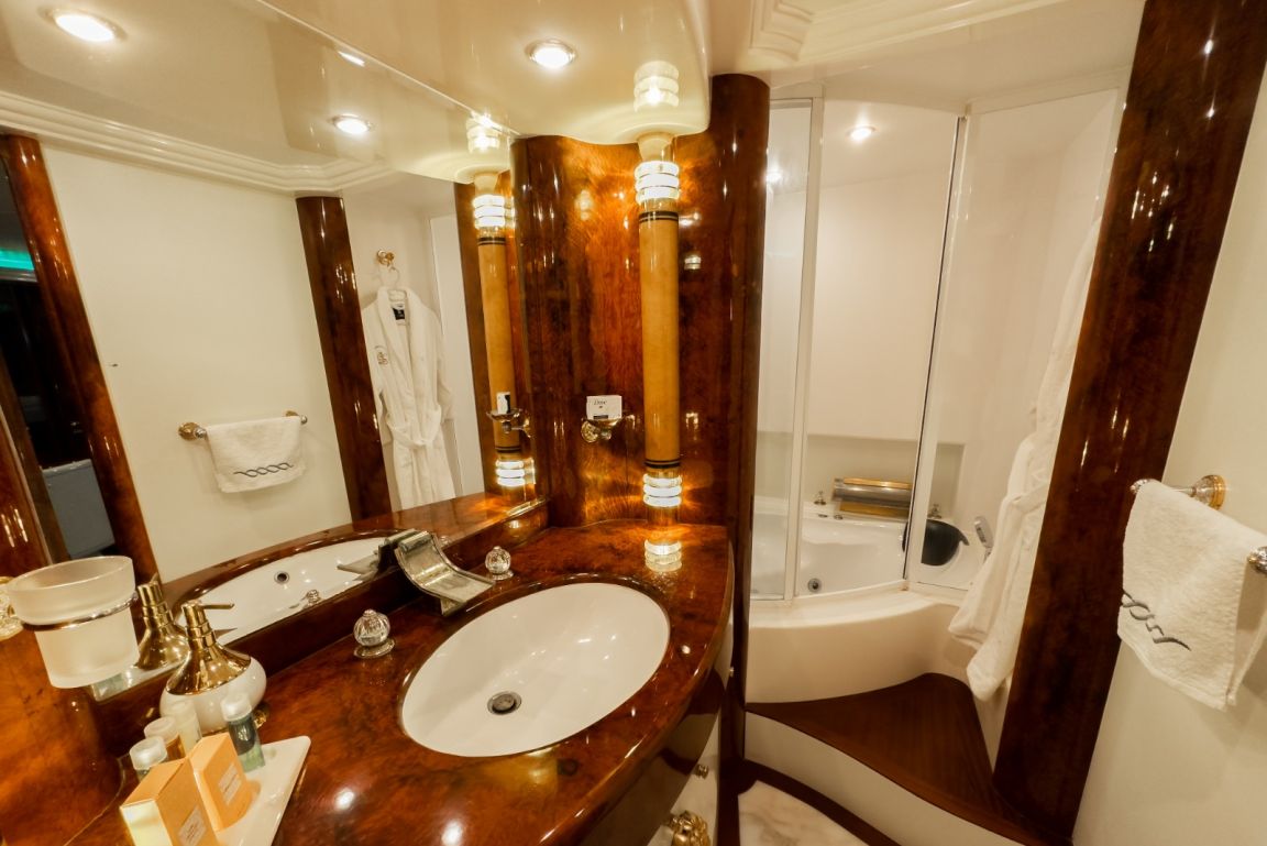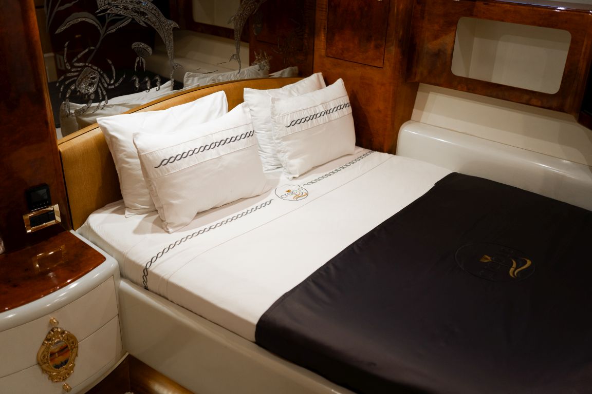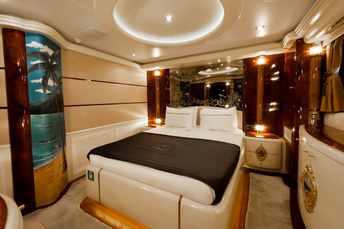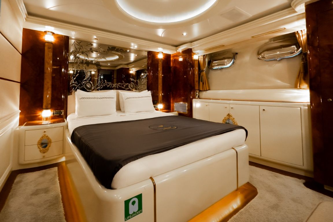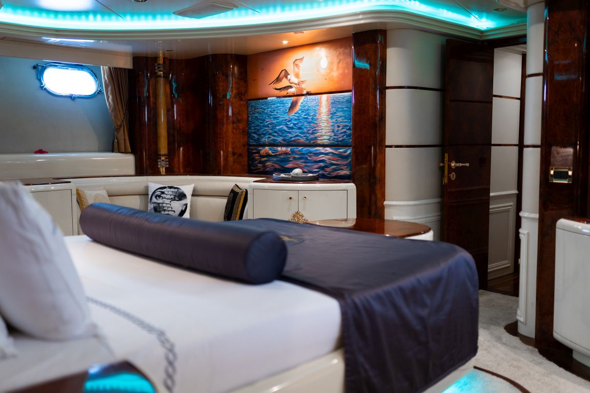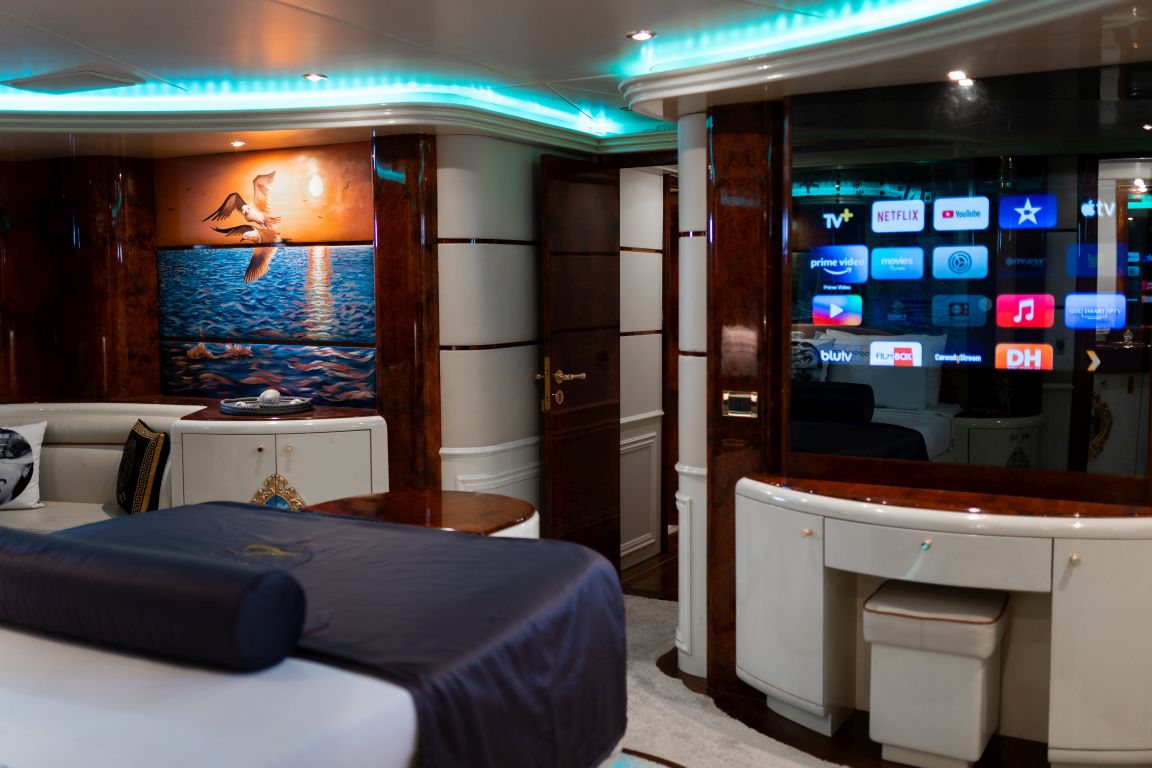 Up to 12 Guest; 1 VIP, 1 Master, 3 Double, 1 Twin Cabins. Master Cabin: Located on the lower deck, the spacious master cabin features a king size bed, Apple TV, internet access and Wi-Fi, a work/vanity desk and a cinema sound system. The cabin also includes RGB ambient lighting, air conditioning, jacuzzi, WC and a separate shower cabin. VIP Cabin: The VIP cabin is located on the main deck and offers a king size bed, Apple TV, internet access and Wi-Fi, a work/vanity desk and cinema sound system. Guests can enjoy RGB ambient lighting, air conditioning, jacuzzi, WC and a private shower cabin. Double Cabins (3): Three comfortable double cabins are located on the lower deck. Each cabin features a queen size bed, Apple TV, internet access and Wi-Fi, WC, shower cabin or bathtub and air conditioning. Twin Cabin: The twin cabin located on the lower deck offers two single beds, Apple TV, internet access and Wi-Fi, WC, shower cabin and air conditioning. |