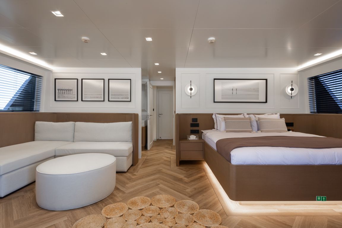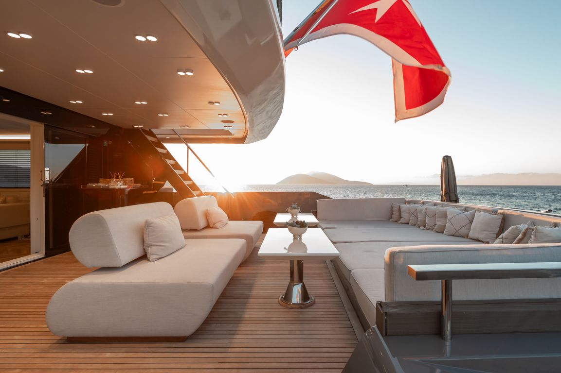 The interior of Illusion II features a sophisticated salon with contemporary decor, comfortable seating areas and a bright, open atmosphere, perfect for relaxing and socializing. The yacht`s exterior spaces are equally impressive, with large decks designed for maximum enjoyment. The aft deck offers a spacious dining area, while the flybridge provides panoramic views, sunbathing areas and a jacuzzi, creating the perfect setting to relax under the Mediterranean sun.